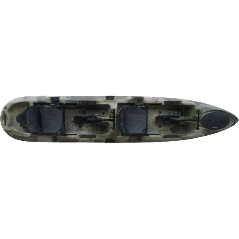 The Brooklyn Kayak BKC PK14 is the longest tandem kayak of the BKC brand. Integrated with a dual pedal drive system that allows you to race across the open waters. With tracking available in its 14 foot narrow body and grooved hull bottom, it will keep the kayak moving full steam ahead. Designed with convenience and comfort in mind the seats are ergonomically built with sturdy lightweight aluminum. Whether you’re pairing the pedal and paddle power together or even upgrading to an electric trolling motor, there is no way you won’t get the power you deserve in your next kayak right here! Relax in the rear seat which has the hand-operated rudder control system that allows for precise, responsive turns with no paddle steering required. Spend your day the way you want, and that is hours on the water in a vessel fully capable of stowing up to 660 weight capacity. So bring the friends, bring your gear and pull out your 20 liter cooler to fit into the rear cargo storage area and set out for your next adventure in the BKC PK14.