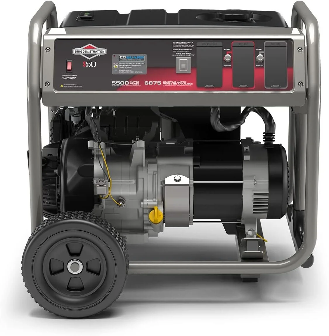 Keep your lights on, your food cold, your family connected and more during a power outage with this Briggs & Stratton 5,500-Watt portable generator. Its easy-maneuvering design also makes it great for home improvement projects and recreational activities. Its Briggs & Stratton PowerBuilt engine is rugged, reliable and can run for up to 12.5-hours at 50% load. Power household essentials with a transfer switch through the 120-Volt/240-Volt 30 Amp outlet or power outdoor tools with the four 120-Volt GFCI outlets.
