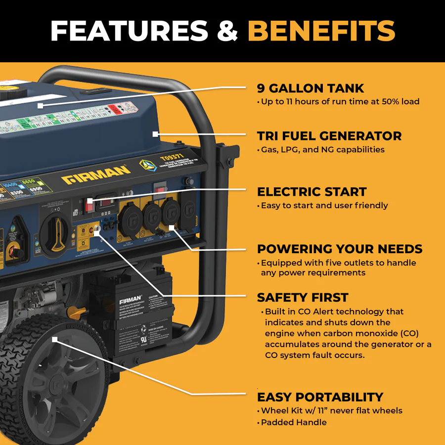 - Starting watts 11400W (GAS), 10400W (LPG), 8650W (NG)