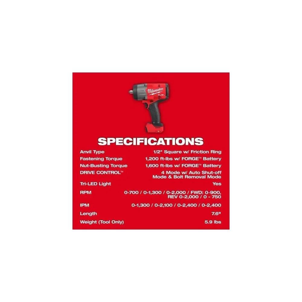 2967-22GG: Most Power Dense – Best Combination of Power and Size. POWERSTATE™ Brushless Motor delivers up to 1100 Ft.-Lb of Fastening Torque & 1500 Ft.-Lb of Nut-Busting Torque with M18™ REDLITHIUM™ XC5.0 Battery. Up to 2 In. Shorter Length. 7.6 In. in length provides most access in tight spaces. Fastest Removal Speeds. Maximize productivity on the jobsite and in the shop. Patented battery isolation system ensures a secure battery connection and controls vibration transmitted to the pack. Tri-LEDs deliver high definition lighting to increase workspace visibility with less shadows. 4-Mode DRIVE CONTROL™ provides greater control over output speed and power. Includes auto shut-off and bolt-removal mode. Bolt removal mode provides maximum nut-busting torque to break fastener free, then slows to 750 Rpm for more control when removing fasteners. AUTO-SHUTOFF™ control prevents over tightening and increases productivity by applying no more than 50 ft-lbs of torque. Mode 1 Ipms: 0-1300; Mode 2 Ipms: 0-2200; Mode 3 Ipms: 0-2400; Mode 4 Ipms: 0-2400. Mode 1 Rpms: 0-700; Mode 2 Rpms: 0-1300; Mode 3 Rpms: 0-2000; Mode 4 Rpms: FWD: 0-900, REV: 0-2000/0-750. Friction ring (hog ring) ensures quick and easy socket changes. M18™ REDLITHIUM™ XC5.0 Resistant Battery included provides increased protection against oils, greases, and solvents. REDLINK PLUS™ Intelligence: Ensures maximum performance and protects from overloads, heating, and over-discharge. Compatible with all M18™ batteries & chargers.