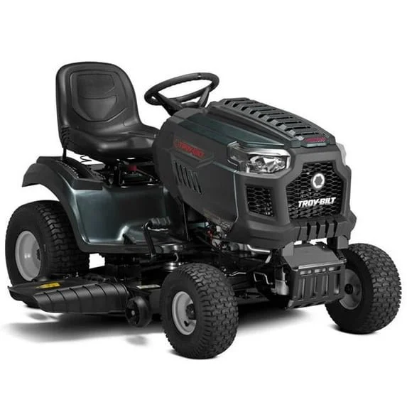 Troy-Bilt XP 46 in. cut lawn tractor with a 22hp Kohler twin cylinder engine. It comes with a reinforced fabricated steel deck, twin blade cutting deck, foot operated hydrostatic transmission, electric blade engagement, operator controlled mow in reverse, two front and two rear anti-scalp deck wheels, twelve-position spring assisted deck height adjustment, cast iron front axle and a 3-year limited . It also features a 16 in. turning radius, a fully robotically welded frame, cruise control, integrated deck wash system, exterior fuel sight gauge, 15 in. x 6 in. front & 20 in. x 8 in. rear square shoulder tires and and adjustable high back seat.