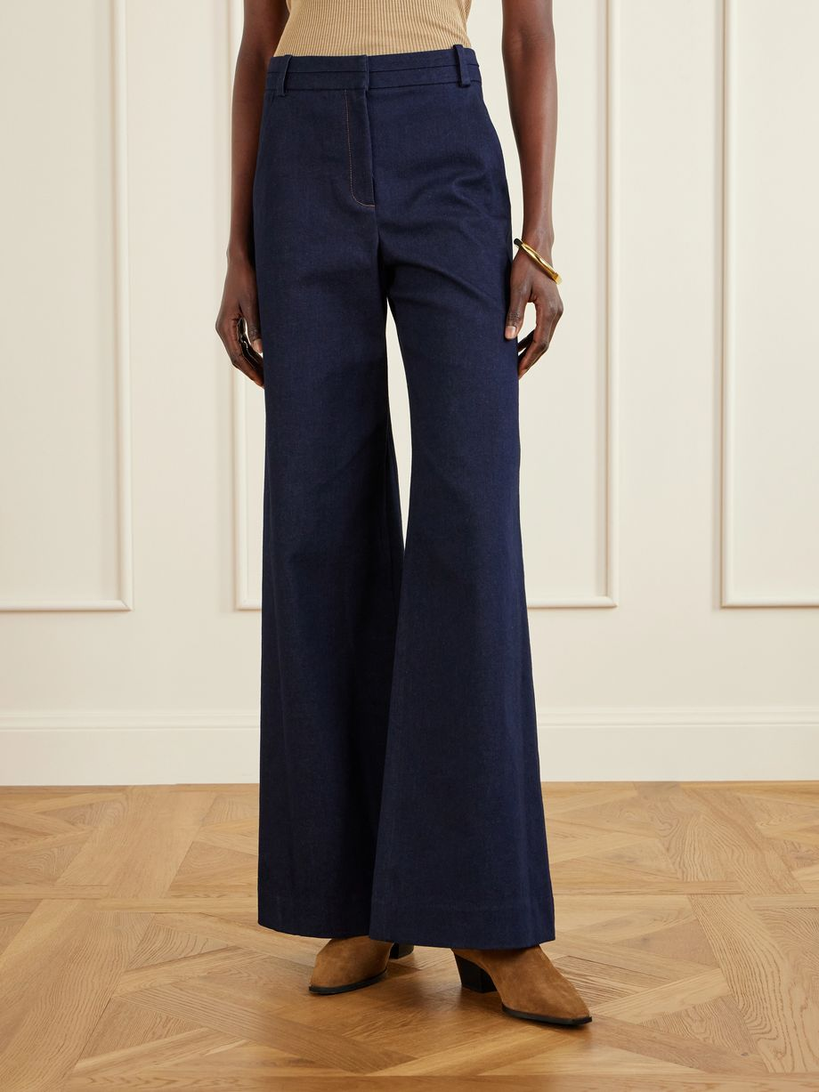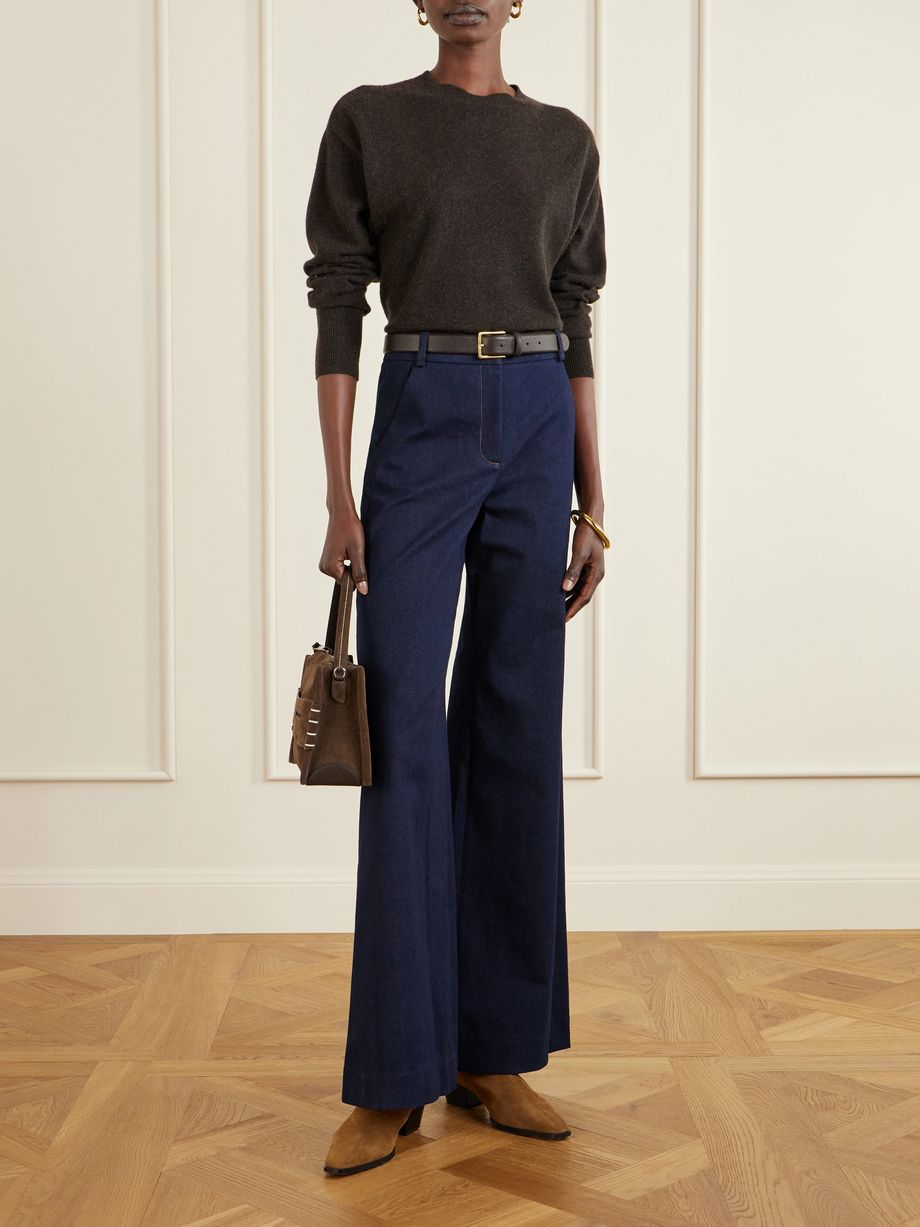 • Fit: High‑rise skinny with flared hem