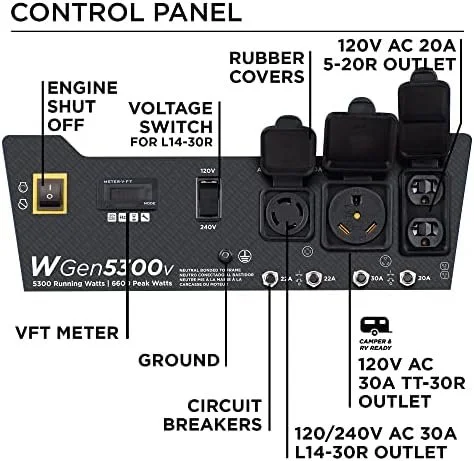 - Features One 5–20R 120V 20A Household Duplex Receptacle, One RV-Ready TT-30R 30A Receptacle, and One Transfer Switch Ready L14-30R 30A Receptacle; All Outlets Have Rubber Covers for Added Safety